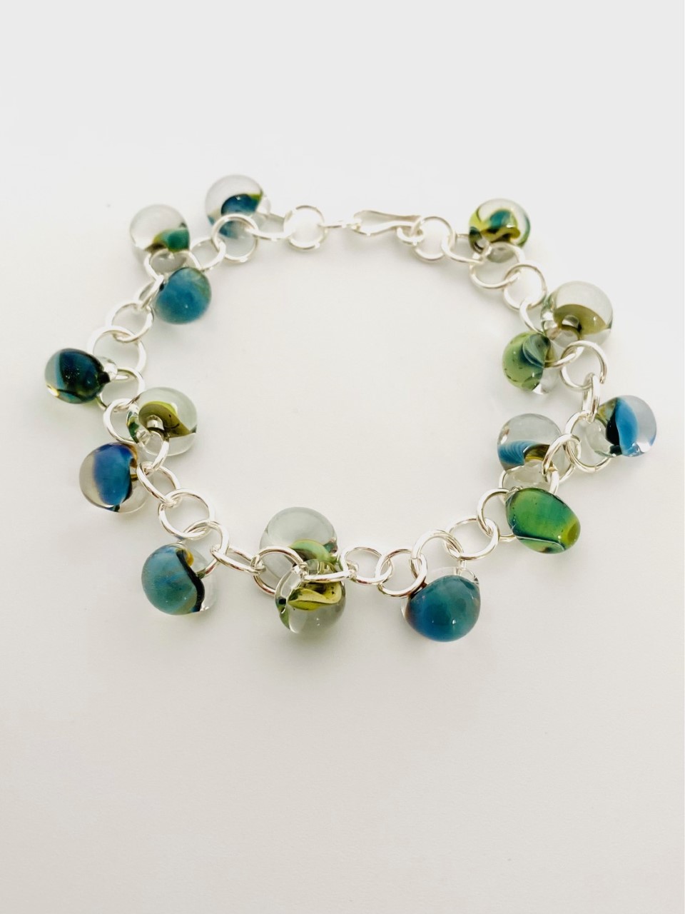 Colourful glass bead bracelets created from silver rings and borosilicate glass teardrop beads. Each bracelet is finished with a handmade hook clasp. Please note there are variations of colour within the beads.