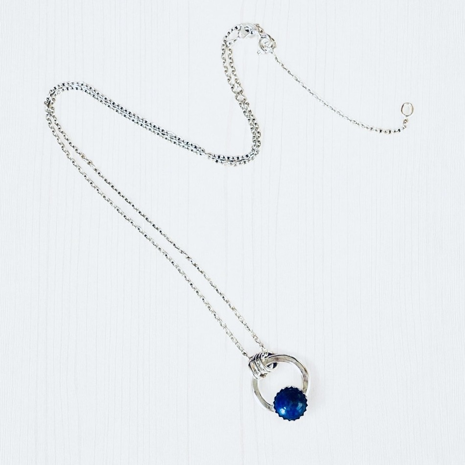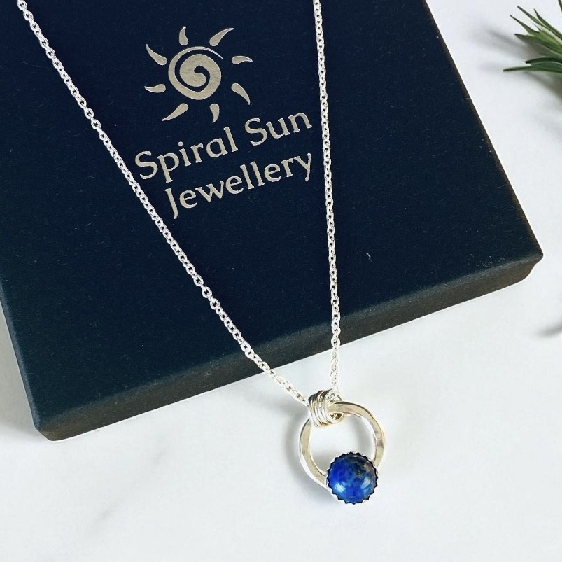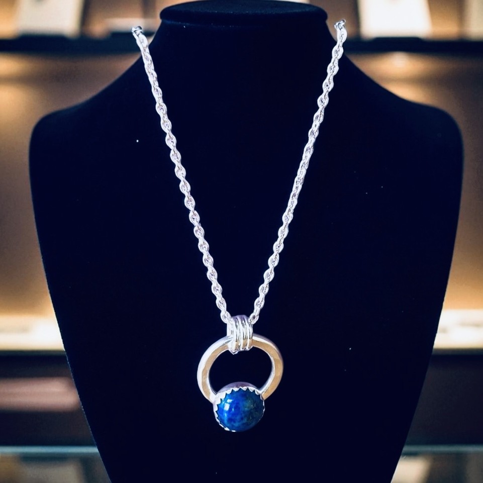 Lapis lazuli is such a beautiful deep blue stone and contrasts well with silver. The lapis lazuli stone is set onto a small hammered silver circle which is attatched to the chain with three small silver rings. The piece hangs from an adjustable belcher chain which can hang at 16″ or 18″.
